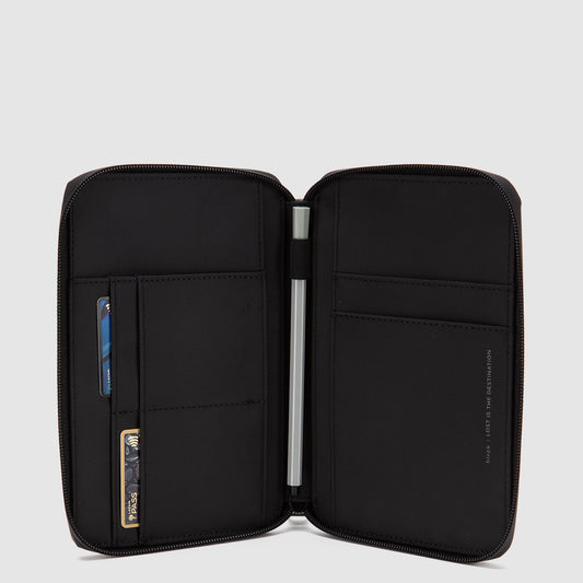 Espacio para dos pasaportes, tarjetas, papeles y lápiz