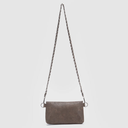 Snake es una línea que combina elegancia y comodidad. Sus detalles metálicos y la textura de serpiente aportan sofisticación, mientras que los acabados mates y los colores neutros le dan un toque relajado y versátil. Una opción que se ajusta a muchas ocasiones de uso y su tamaño es ideal para salir de fiesta.
